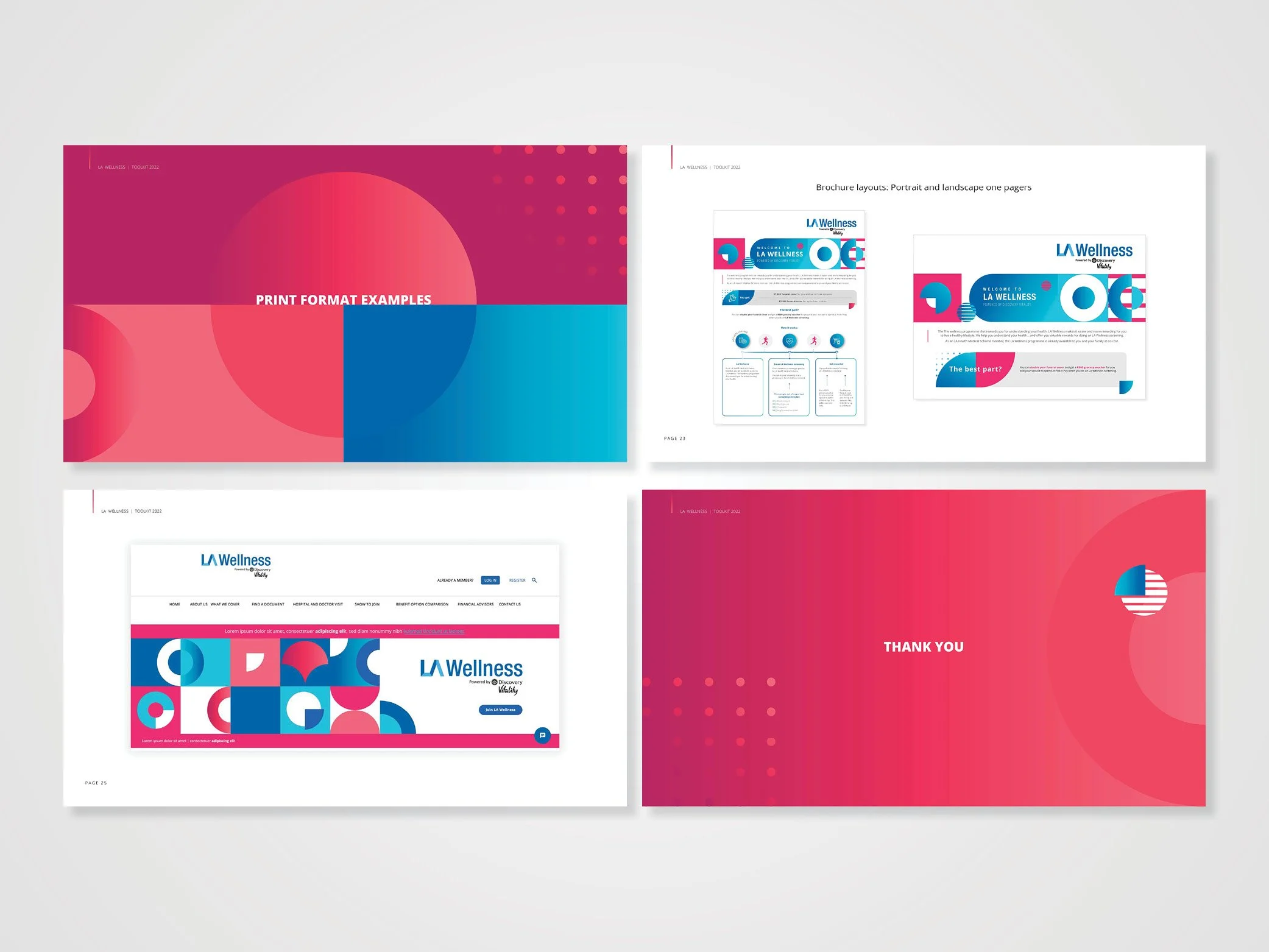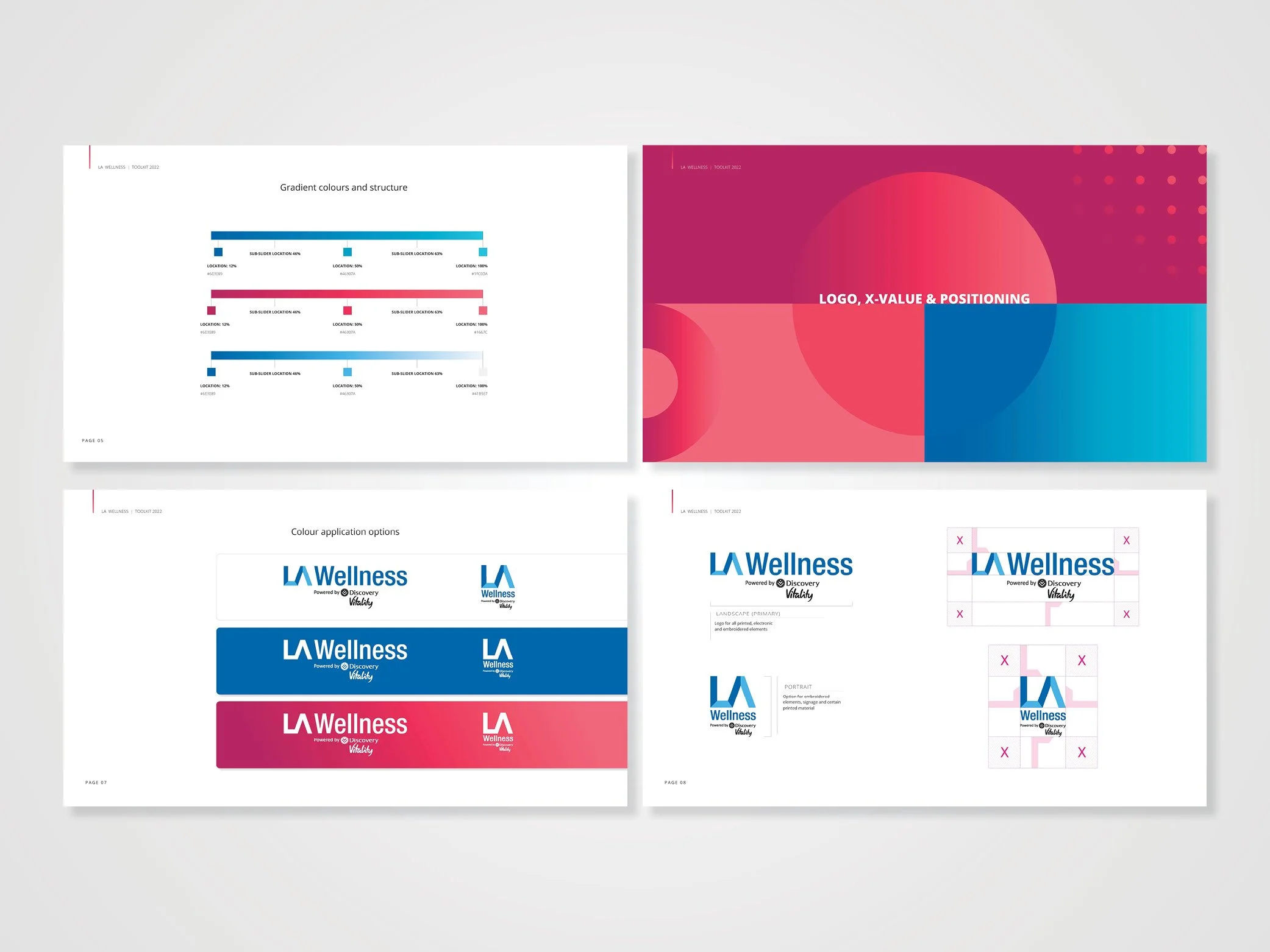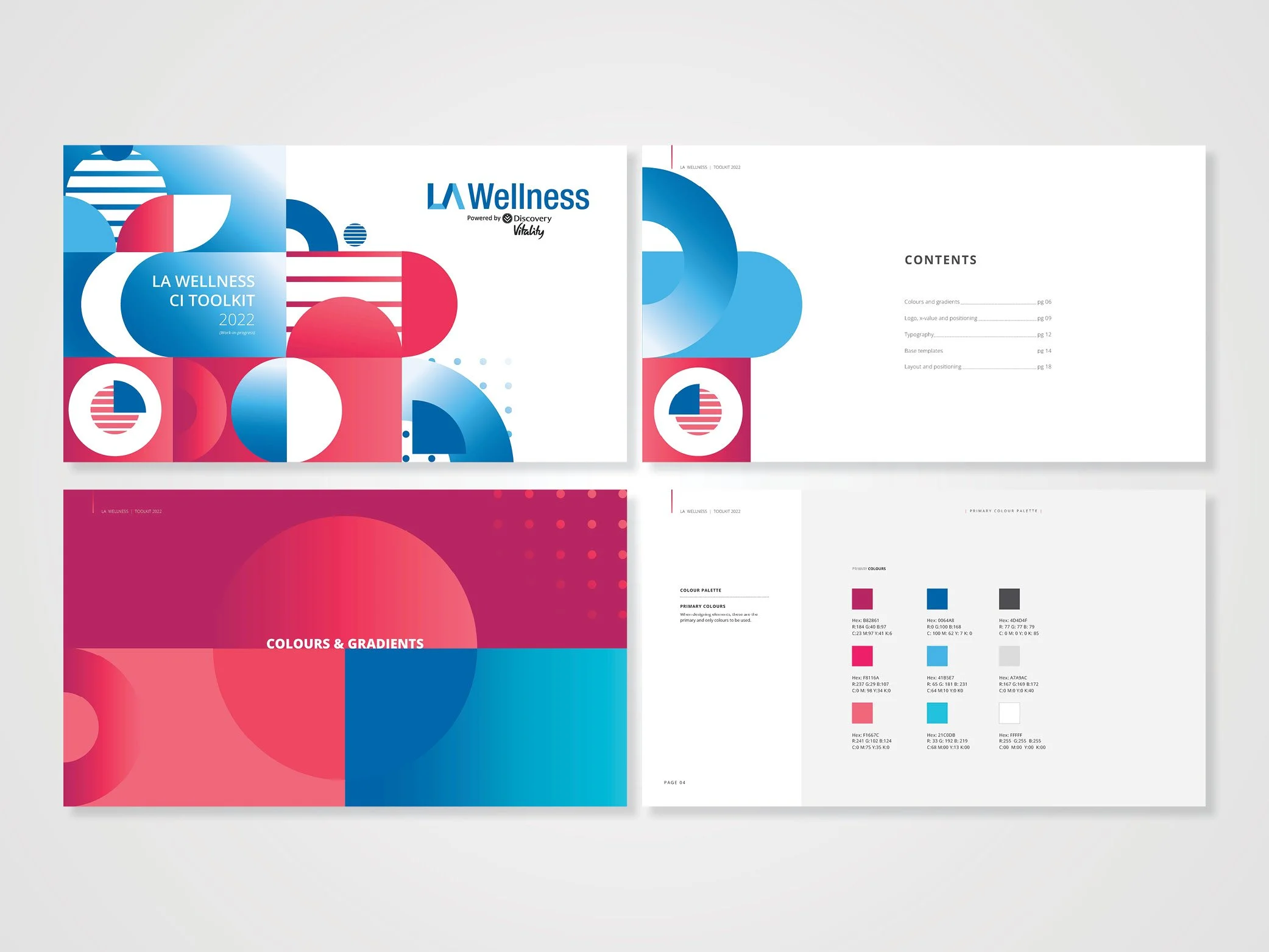 As art director, I developed a cohesive visual identity to seamlessly integrate with LA Health’s existing brand ecosystem under the Discovery Vitality parent brand. I crafted a collection of resources and guidelines that help the new child brand (LA Wellness) maintain a consistent and coherent brand identity across different channels and touchpoints. It includes logo variations, typography, colours and gradients, base templates for digital and print media, as well as layout and positioning.
